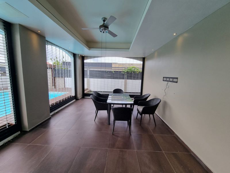 Aan de achterzijde van de woning bevindt zich een uitnodigend balkon dat direct aansluit op een privé zwembad – perfect voor ontspanning of het ontvangen van gasten. De woning is volledig voorzien van airconditioning in alle vertrekken. Er is zowel warm als koud water aanwezig en het pand is uitgerust met camerabeveiliging voor extra veiligheid.